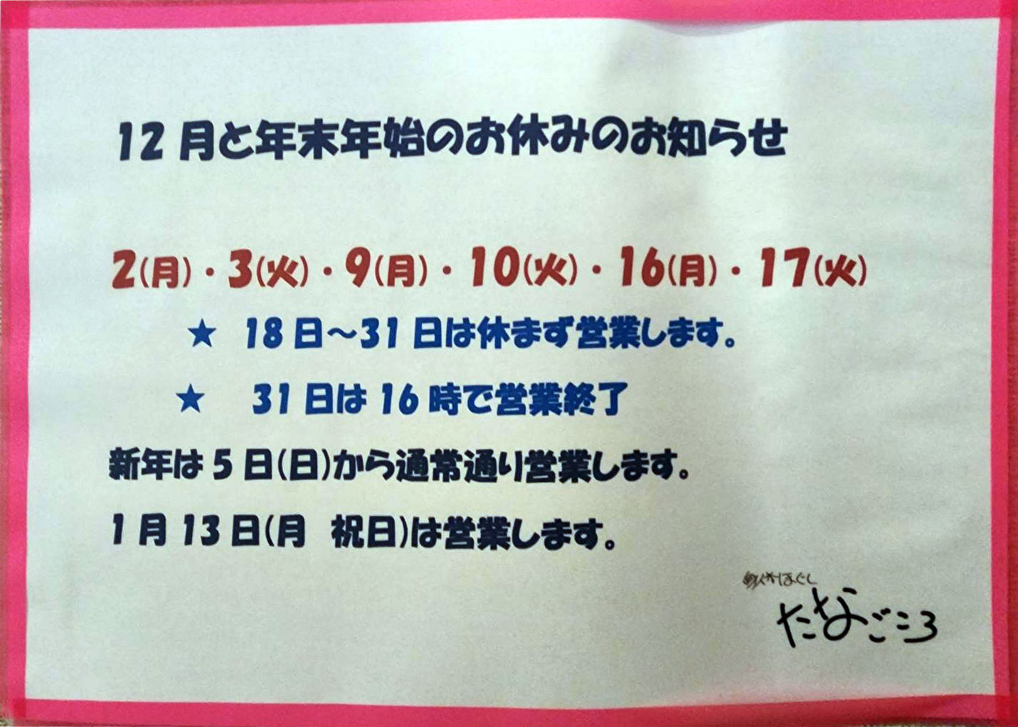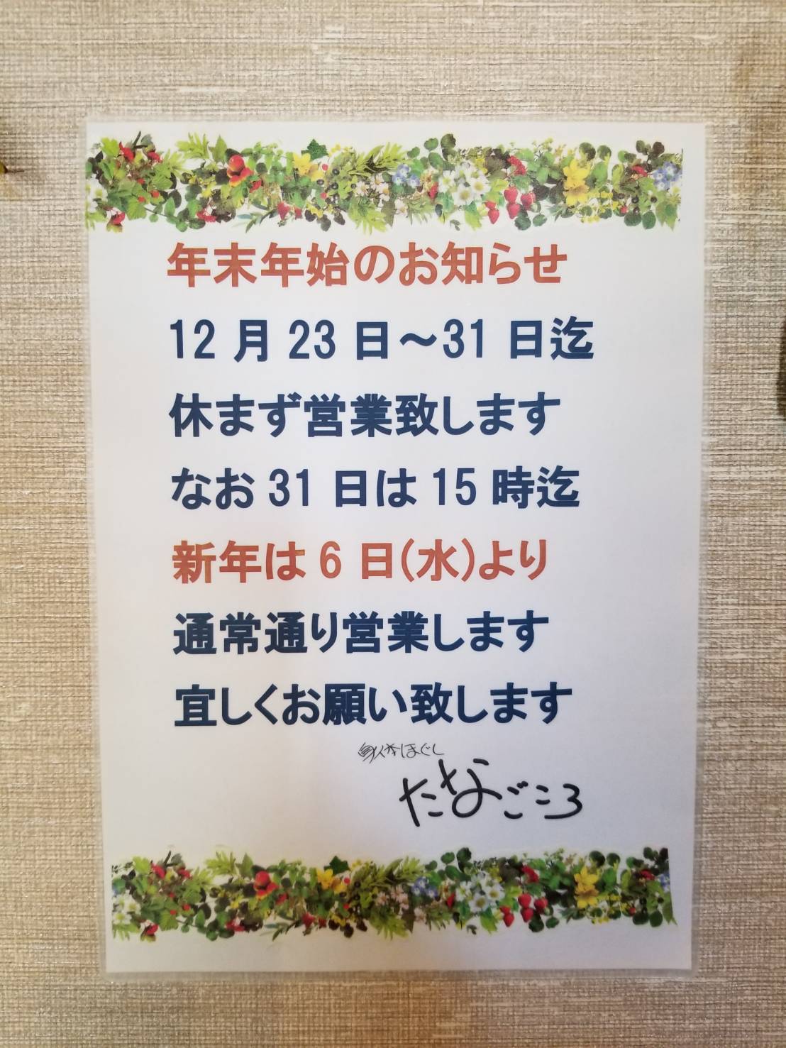 今年も1年、たなごころをご贔屓にしていただきましてありがとうございました。来年もどうぞよろしくお願いいたします。