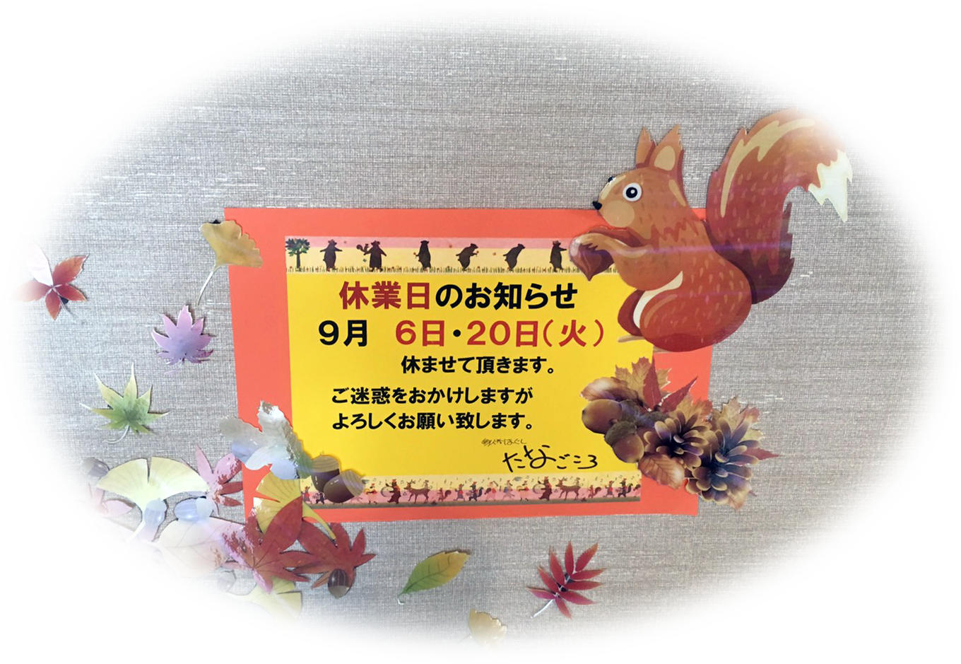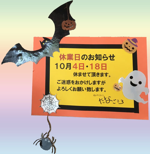 10月の定休日情報を更新いたしました。急に涼しくなり体調を崩しやすい時期ですので、体調管理にはお気を付け下さい。