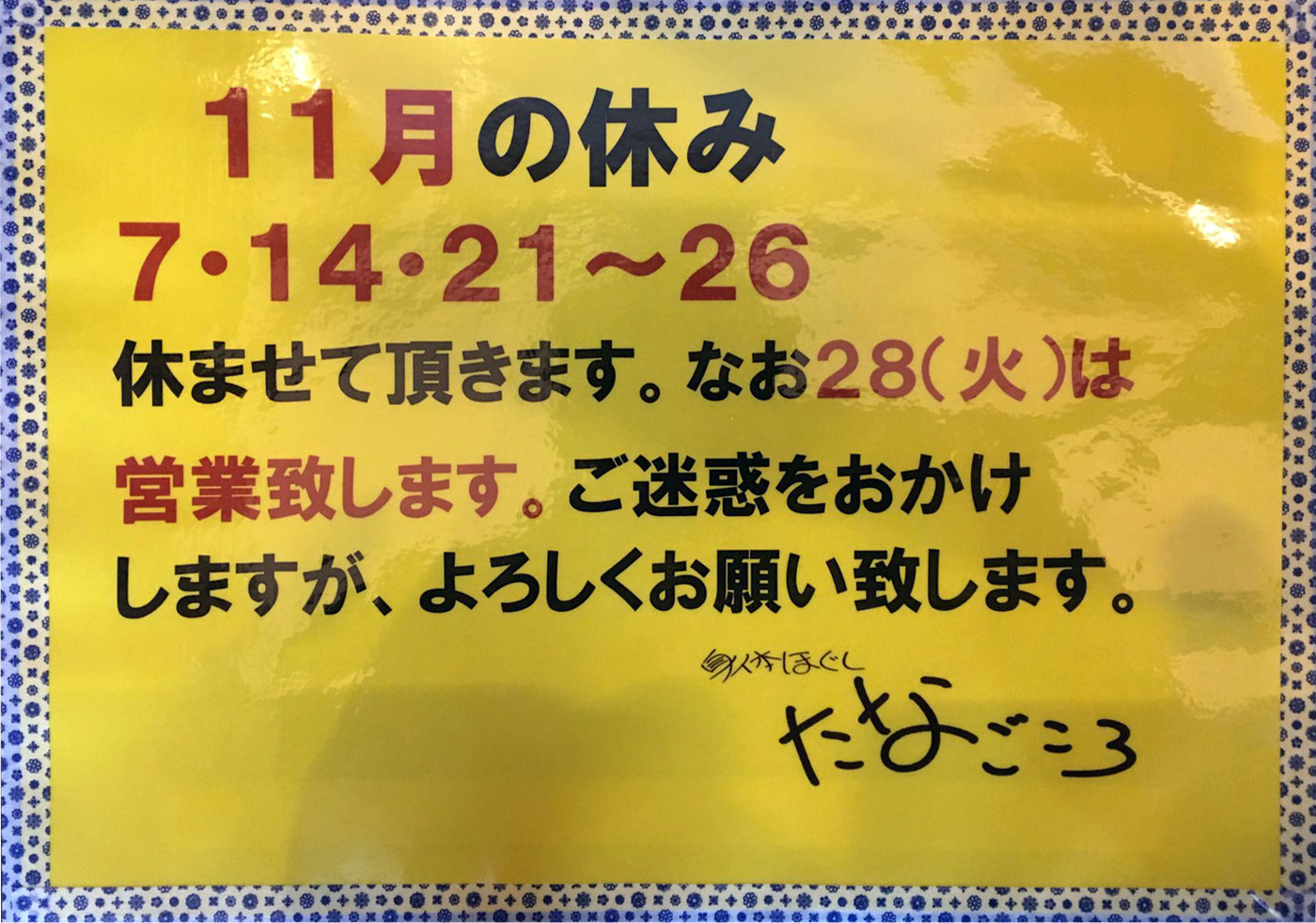 いつも当店をご贔屓賜りまして誠にありがとうございます。当店は 11月10日(火) 11月24日(火) の営業を休ませていただきます。 ご理解のほど、よろしくお願い申し上げます。