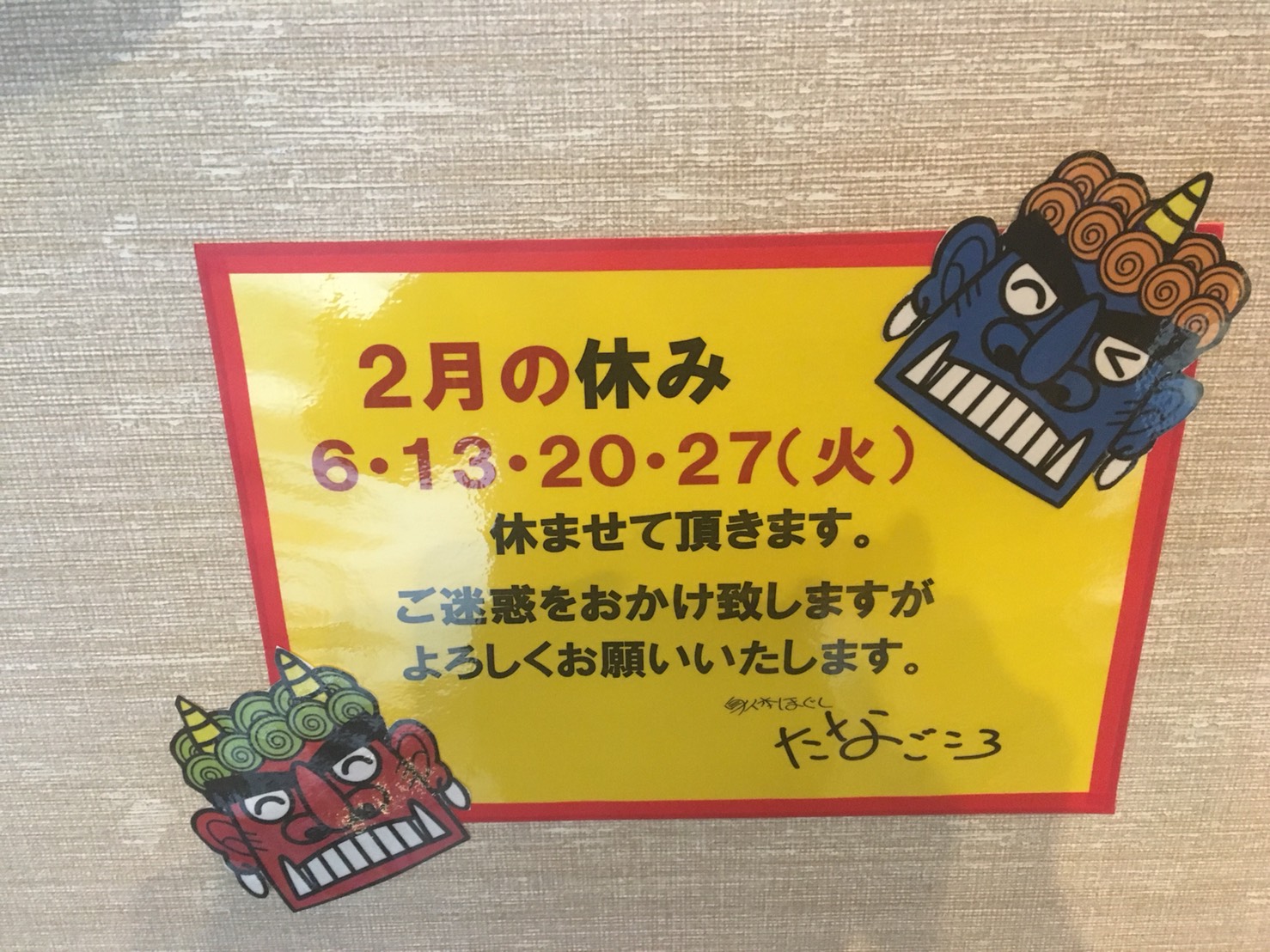 今月も毎週火曜日にお休みを頂戴します。よろしくお願いいたします。