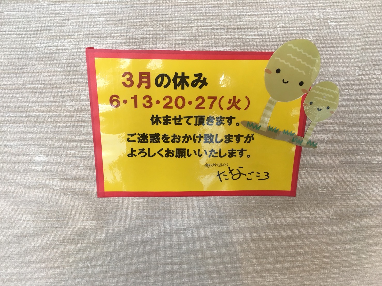 さて、今月も毎週火曜日にお休みさせていただきます。
