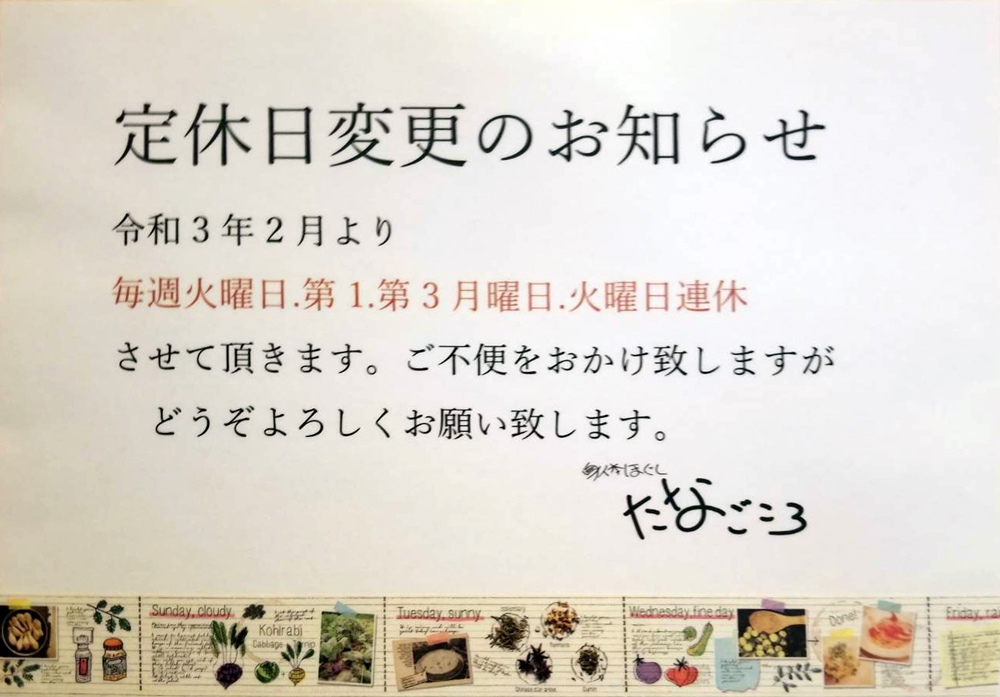 2021年2月より定休日を変更させていただきます