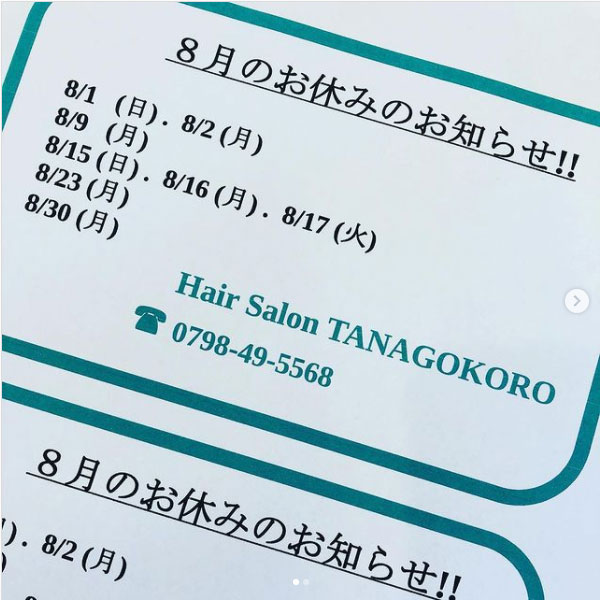 【ヘアーサロンたなごころ】 毎週月曜日・火曜日 15日(日)はお盆休みを頂戴します