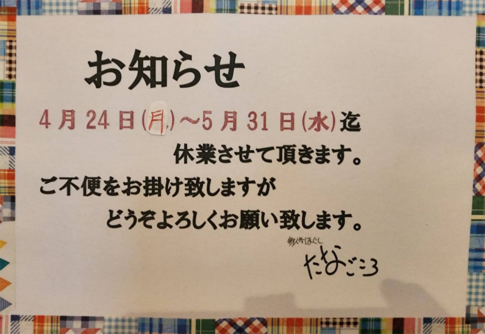 いつも当店をご利用いただきありがとうございます。当店は事情により下記の間休業させていただくことになりました。