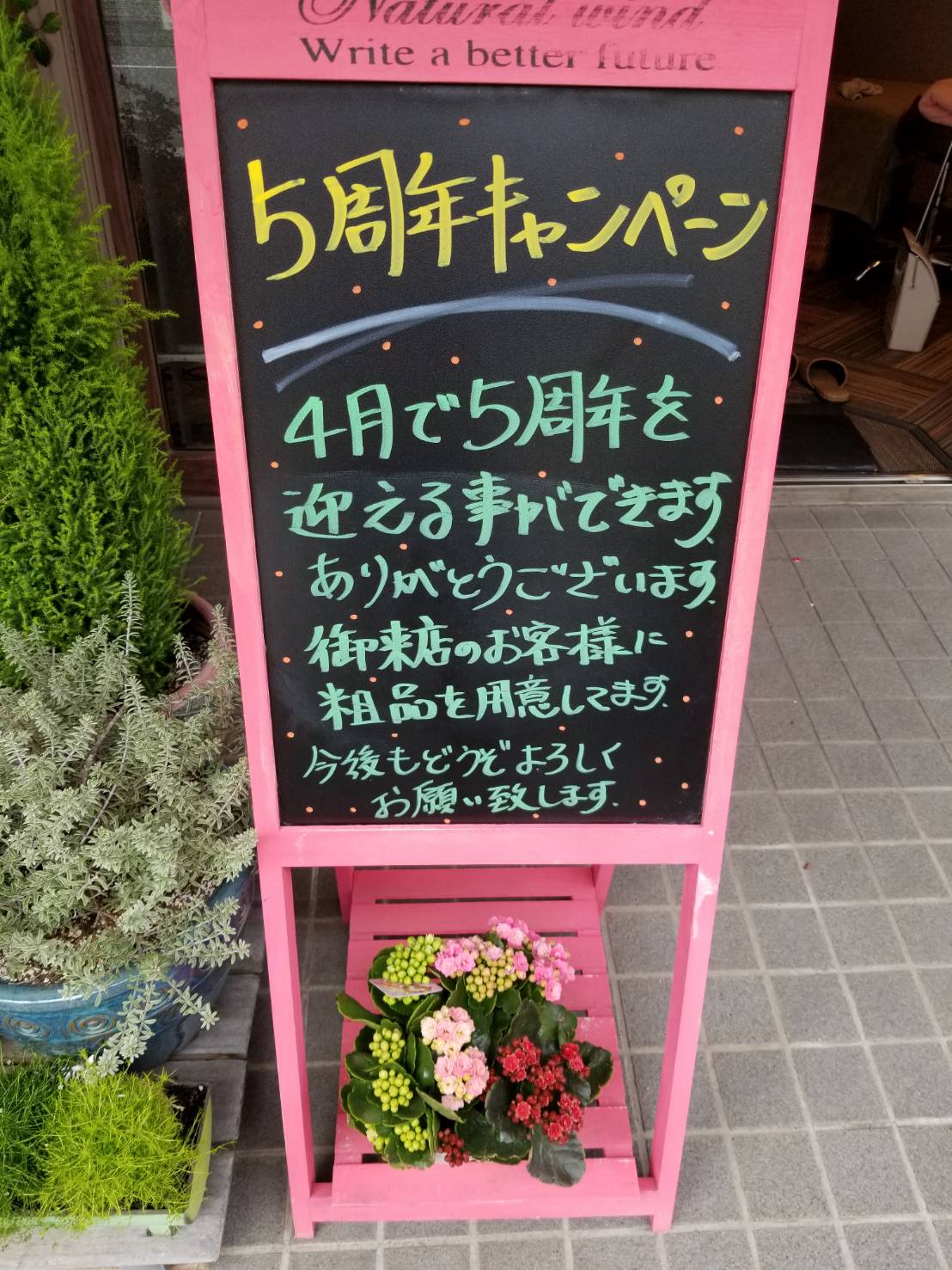 今月は「5周年キャンペーン」としてご来店のお客様に粗品をご用意してお待ちしております。
